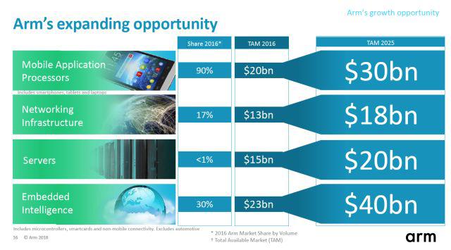 與中國手機(jī)廠商不同,Arm一直面向的是全球市場,全球移動設(shè)備增速下降一定會影響到今后的增長,而截止2016年,Arm移動應(yīng)用處理器市占率已經(jīng)高達(dá)90%,可增長空間有限。所以,Arm必須在移動設(shè)備增長放緩之際加大拓展新應(yīng)用方向的力度。