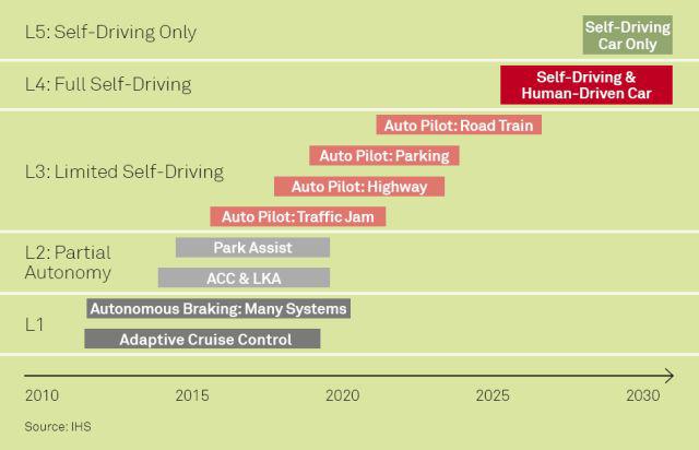 傳統(tǒng)汽車廠商大多準(zhǔn)備采取循序漸進(jìn)方式,遵循美國(guó)汽車工程師學(xué)會(huì)(SAE)的層級(jí)劃分,從第二級(jí)逐漸到第三級(jí),最后發(fā)展到全無人駕駛。2017年推出的新款?yuàn)W迪A8,就號(hào)稱是全球第一款達(dá)到L3級(jí)別的量產(chǎn)汽車。傳統(tǒng)車廠的另一個(gè)方向是開發(fā)限制場(chǎng)景下的自動(dòng)駕駛技術(shù),例如戴姆勒等廠商主導(dǎo)的自動(dòng)駕駛車隊(duì)項(xiàng)目,即是針對(duì)高速貨運(yùn)場(chǎng)景開發(fā)的自動(dòng)駕駛技術(shù)。