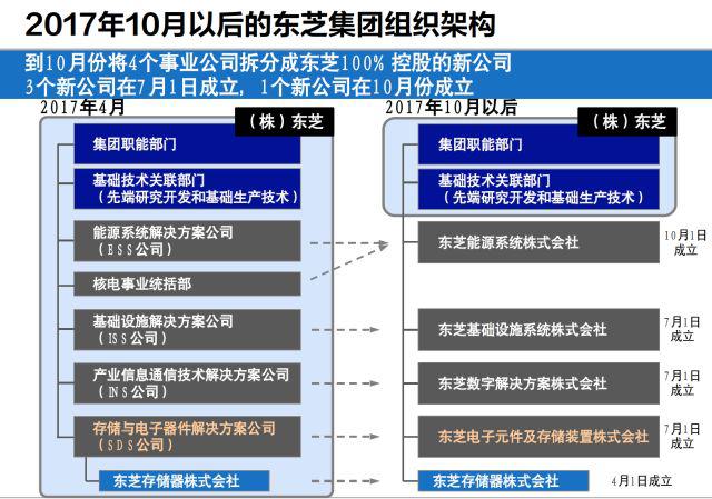 但西屋電氣困境對(duì)東芝影響頗大。為解決財(cái)務(wù)危機(jī),東芝最開(kāi)始考慮將存儲(chǔ)器部門(mén)出售,東芝存儲(chǔ)器株式會(huì)社于2017年4月成為東芝控股的獨(dú)立子公司,隨后東芝集團(tuán)內(nèi)部進(jìn)行了大規(guī)模調(diào)整,將其內(nèi)部事業(yè)公司分拆為5家(含東芝存儲(chǔ)器)東芝集團(tuán)控股的獨(dú)立子公司。