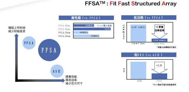 FFSA(快速適應(yīng)結(jié)構(gòu)陣列,F(xiàn)it Fast Structured Array)所瞄準(zhǔn)的市場(chǎng)空間介于FPGA與ASIC之間。吉本健表示,與FPGA相比,F(xiàn)FSA的功耗與成本更低;與ASIC相比,F(xiàn)FSA可配置易開(kāi)發(fā),迭代周期短,更符合當(dāng)今時(shí)代廠商對(duì)產(chǎn)品開(kāi)發(fā)時(shí)間窗口的需求。“FPGA的初期投入比較少,但是一旦量產(chǎn),其成本和功耗就顯得非常高。ASIC開(kāi)發(fā)周期比較長(zhǎng),而且先期的費(fèi)用比較高?,F(xiàn)在常見(jiàn)的狀況是先用FPGA開(kāi)發(fā)應(yīng)用,這樣一開(kāi)始比較快,但是需要降本的時(shí)候,客戶會(huì)轉(zhuǎn)到FFSA上?!?