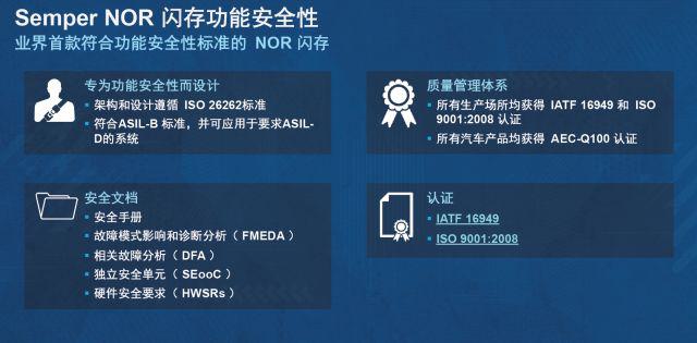 Sam Geha將車載系統(tǒng)對下一代存儲技術(shù)的需求總結(jié)為四點。首先,從產(chǎn)品定義到生產(chǎn),功能安全性必須遵循ISO 26262(道路車輛功能安全標準)和IEC61508(電氣/電子/可編程電子安全相關(guān)系統(tǒng)的功能安全)標準?!耙ㄟ^ISO 26262,需要做非常多的工作,賽普拉斯的閃存新產(chǎn)品Semper,是第一款從開發(fā)到生產(chǎn)都滿足ISO 26262標準的存儲產(chǎn)品,這是賽普拉斯閃存產(chǎn)品與其他產(chǎn)品的重要區(qū)別。”