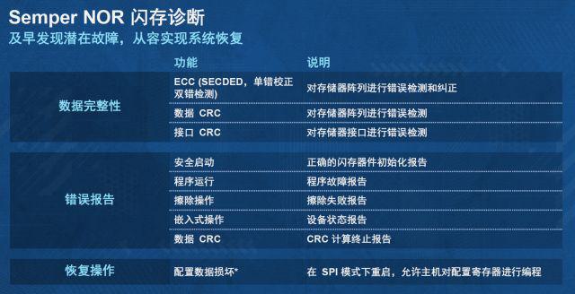 Semper產(chǎn)品集成一顆Arm M0內(nèi)核,因此本地具備了診斷功能。Semper本身可實現(xiàn)數(shù)據(jù)完整性校驗,包括ECC、數(shù)據(jù)CRC與接口CRC;還可提供數(shù)據(jù)狀態(tài)報告,例如閃存器件初始化報告、程序故障報告、擦除失敗報告、設備狀態(tài)報告、CRC計算終止報告等;當由于寫入期間掉電導致配置數(shù)據(jù)損壞時,還可進行恢復操作,即在SPI模式下進行重啟,允許主機對配置寄存器進行編程。