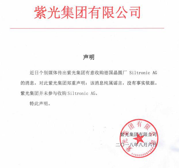 最近,有媒體傳出紫光集團(tuán)已決定斥巨資收購德國芯片廠世創(chuàng)(Siltronic AG),隨后在昨天(8月6日)紫光發(fā)布聲明進(jìn)行辟謠:該消息純屬謠言,沒有事實(shí)依據(jù)。紫光集團(tuán)并未參與收購Siltronic AG。