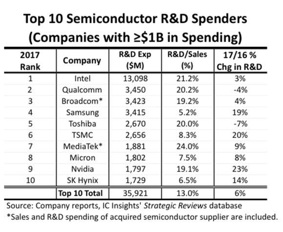 最后我們?cè)倏匆粋€(gè)數(shù)據(jù),根據(jù)IC Insights幾個(gè)月前的報(bào)告顯示,半導(dǎo)體行業(yè)在2017年研發(fā)投入共340億美元,而英特爾的研發(fā)投入則超過130億美元,比排在后面的五個(gè)競(jìng)爭(zhēng)對(duì)手高通、博通、三星、東芝和臺(tái)積電加起來還要多。所謂富二代不可怕,就怕富二代比你還努力。
