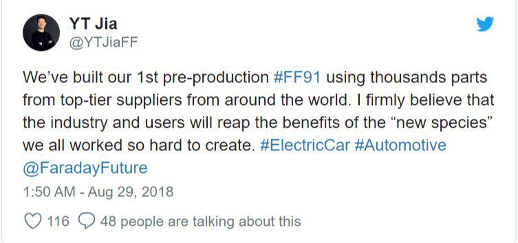 美西時間2018年8月28日(北京時間8月29日)早上11點,F(xiàn)araday Future (下稱“FF”)于美國漢福德工廠舉行了首臺FF91預(yù)量產(chǎn)車下線的慶祝儀式。本周一的時候,CNET媒體就獲得了FF的一封內(nèi)部郵件,郵件顯示是由“CEO 辦公室”發(fā)給法拉第未來團隊:第一臺 FF91 預(yù)產(chǎn)車已經(jīng)完成。