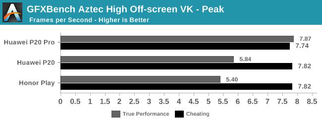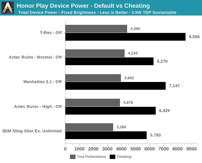 隨后該網(wǎng)站還測(cè)試了Honor Play的功率,從下面的數(shù)據(jù)可以看出,在“真實(shí)性能”的狀態(tài)下,芯片功率為3.5—4W。相比之下,“作弊體”數(shù)據(jù)則完全爆炸了,功率數(shù)據(jù)甚至超過(guò)了6W,而T-Rex達(dá)到了瘋狂的8.5W。在3D電池測(cè)試中,這些數(shù)字很快就能達(dá)到設(shè)備的“過(guò)熱”預(yù)警,這表明熱限制必須超出軟件預(yù)期范圍。
