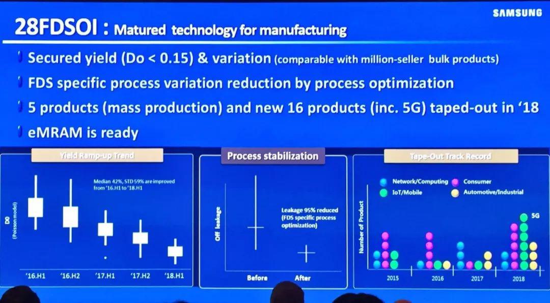 三星電子的28納米FD-SOI工藝已經(jīng)量產(chǎn)5顆產(chǎn)品,在良率方面進(jìn)步很快,截至目前平均缺陷密度(Do)小于0.15,2018年又有16顆新產(chǎn)品流片。三星電子高級(jí)副總裁Gitae Jeong在演講中舉了幾個(gè)客戶案例,在射頻、模擬等領(lǐng)域采用FD-SOI工藝的受益非常明顯,某客戶采用三星28納米FDS工藝生產(chǎn)的射頻芯片,相比原來(lái)的40納米工藝,射頻部分功耗降低了76%,芯片整體功耗降低了65%。三星還和NXP、Cadence聯(lián)合開(kāi)發(fā)了i.MX系列產(chǎn)品,過(guò)去兩年多次流片。