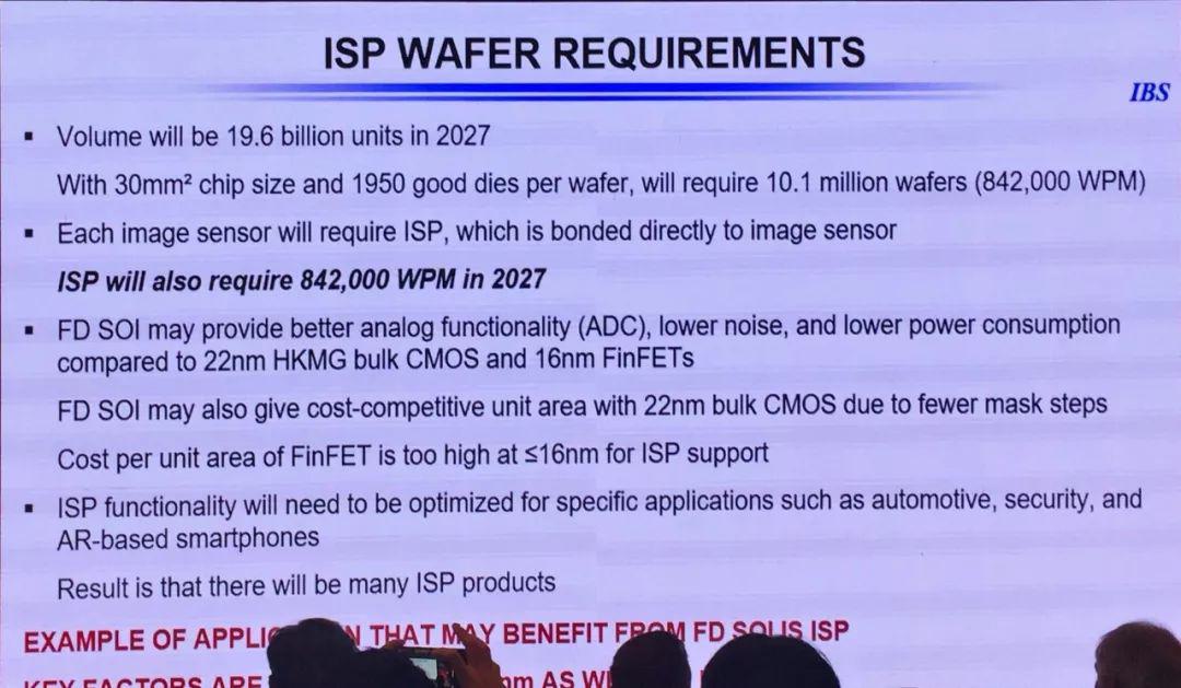 Handel Jones還對(duì)圖像處理芯片(ISP)在FD-SOI領(lǐng)域的前景非??春?,他認(rèn)為無(wú)論是模擬功能、噪聲還是功耗,F(xiàn)D-SOI工藝都比22納米體硅工藝或16納米FinFET工藝要好,而成本上的優(yōu)勢(shì)則更加明顯,在FD-SOI生態(tài)完善后,使用FD-SOI工藝的ISP將會(huì)大量增加。隨著各領(lǐng)域圖像應(yīng)用的爆發(fā)式增長(zhǎng),Handel Jones預(yù)計(jì)到2027年ISP芯片每年需要196億顆,折算成產(chǎn)能,每年需要晶圓制造廠的產(chǎn)能為1010萬(wàn)片晶圓。