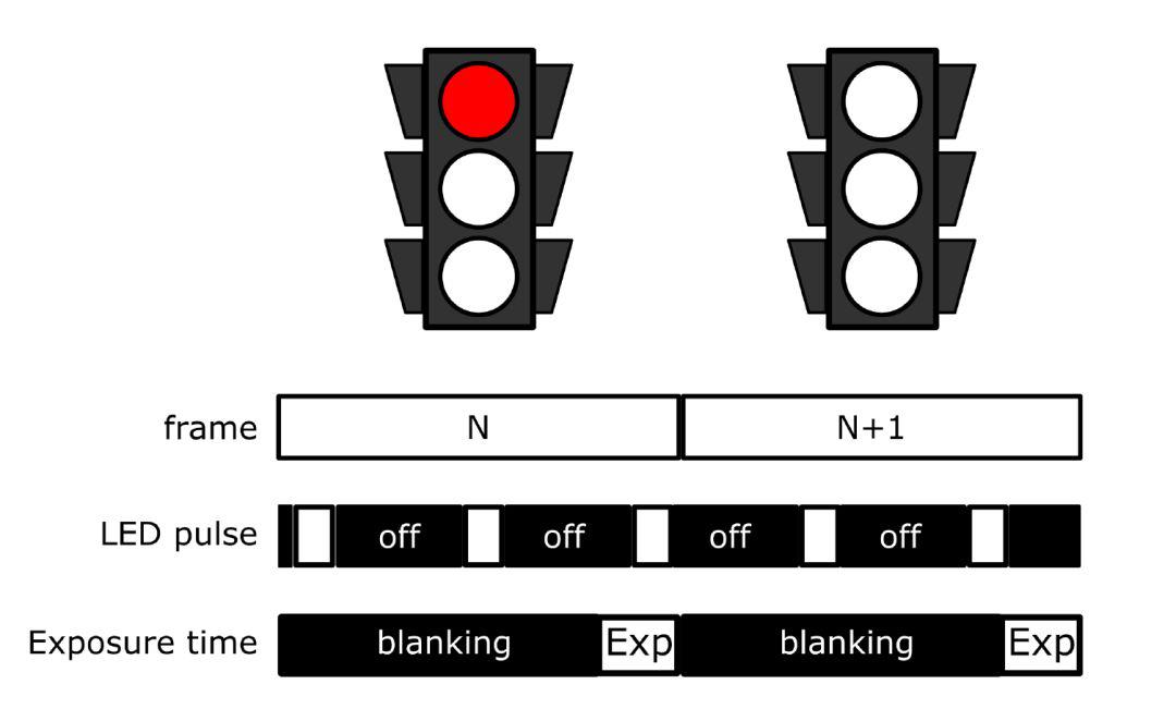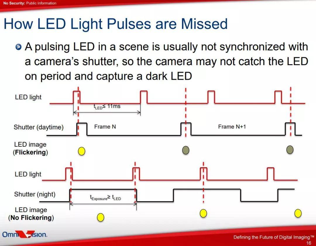 從路燈、交通燈,到車載照明,低功耗、長壽命、高可靠的LED正在快速取代傳統(tǒng)照明方式。但LED在道路上的普遍使用,卻帶來“LED閃爍”現(xiàn)象?!癓ED閃爍”是由LED驅(qū)動方式而產(chǎn)生的現(xiàn)象,LED燈以交流方式驅(qū)動,驅(qū)動頻率一般在90Hz以上,即最慢脈沖周期為11毫秒左右,LED在11毫秒周期內(nèi)實現(xiàn)一次亮滅,為節(jié)能及延長使用壽命,占空比通常不超過50%,如果相機曝光時間較短(例如3毫秒),則有可能曝光時間正好對上LED被關(guān)滅期,這時候圖像傳感器抓到的就是LED滅掉的圖像,如果是LED陣列,在這種情況下拍到的圖像就是一部分亮,一部分暗,這就是“LED閃爍”現(xiàn)象。