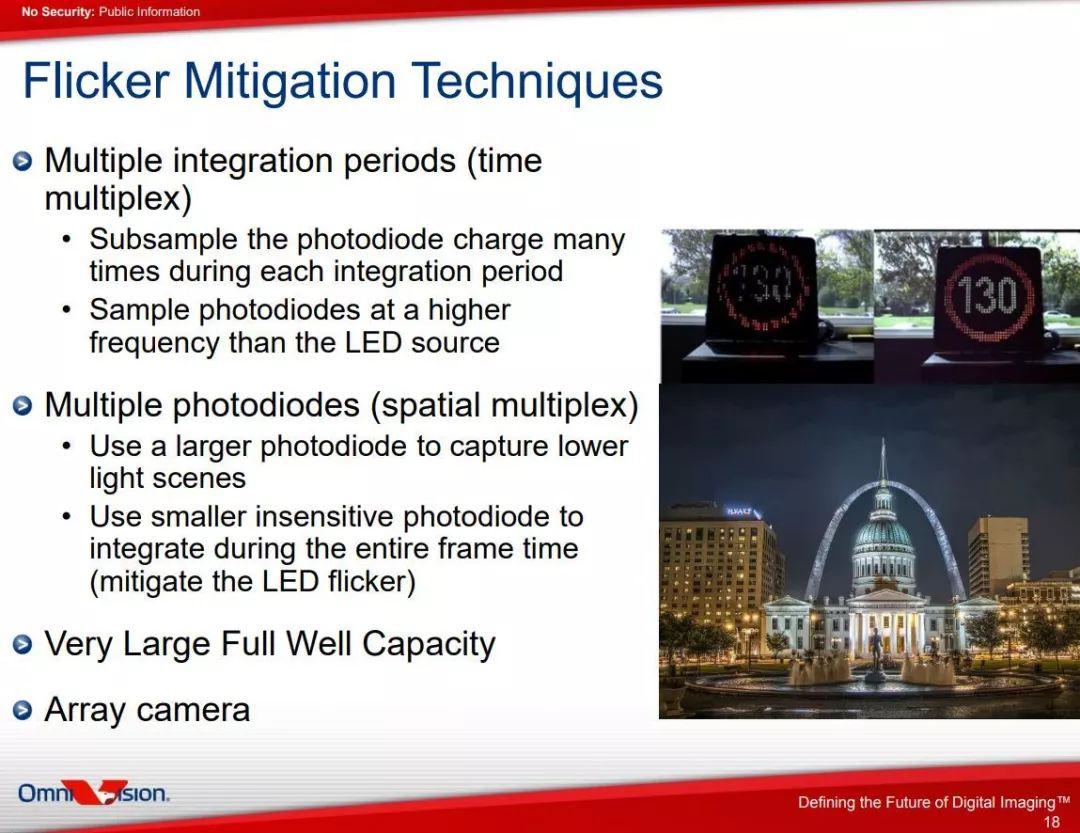 據(jù)豪威科技(OmniVision)中國區(qū)汽車電子業(yè)務(wù)部總監(jiān)劉琦介紹,解決LED在視頻中閃爍的思路是適當延長曝光時間,使其比LED驅(qū)動周期更長,即每次都能捕捉到燈亮的圖像,同時不出現(xiàn)過曝,就可以消除LED閃爍現(xiàn)象。當前,有三種方法可以解決LED閃爍的問題。即側(cè)向溢流積分電容器(LOFIC)技術(shù)、斬波技術(shù)(添加介質(zhì)以過濾圖像信號),以及分離像素技術(shù)(捕捉圖像,而不是順序捕捉)。