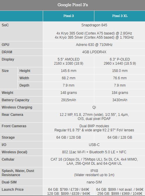 兩款手機外觀風(fēng)格類似,關(guān)鍵參數(shù)和主要配置也基本相同,包括驍龍845處理器、4GB RAM起的運存、IP68級別的防塵防水、雙800萬像素的前置攝像頭和單個1200萬像素后置攝像頭。并且谷歌已經(jīng)大大改進了相機的軟件,其三個亮點功能分別是“Top shot”,“Super res zoom”和“Night sight”。(具體參數(shù)如下)