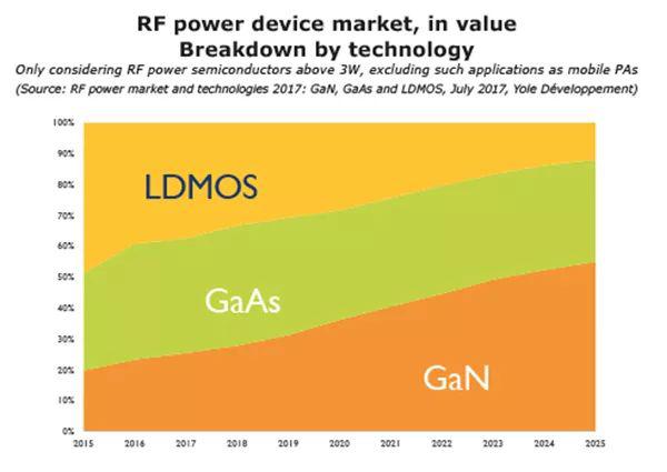當(dāng)前基站與無線回傳系統(tǒng)中使用的大功率射頻器件(功率大于3瓦),主要有基于三種材料生產(chǎn)的器件,即傳統(tǒng)的LDMOS(橫向擴(kuò)散MOS)、砷化鎵(GaAs),以及新興的氮化鎵(GaN)。市場調(diào)研機(jī)構(gòu)Yole(Yole Developpement)的2017年7月的報(bào)告預(yù)測,未來5到10年,砷化鎵在大功率射頻器件市場上所占比例基本維持穩(wěn)定,但LDMOS與氮化鎵將呈現(xiàn)出此消彼長的關(guān)系。2025年,LDMOS占比將由現(xiàn)在的40%左右下降到15%,而氮化鎵將超越LDMOS和砷化鎵,成為大功率射頻器件的主導(dǎo)工藝,占比到2025年可達(dá)45%左右。2019年至2021年為5G基礎(chǔ)設(shè)施建設(shè)的關(guān)鍵期,也將是氮化鎵器件替換LDMOS的關(guān)鍵期。