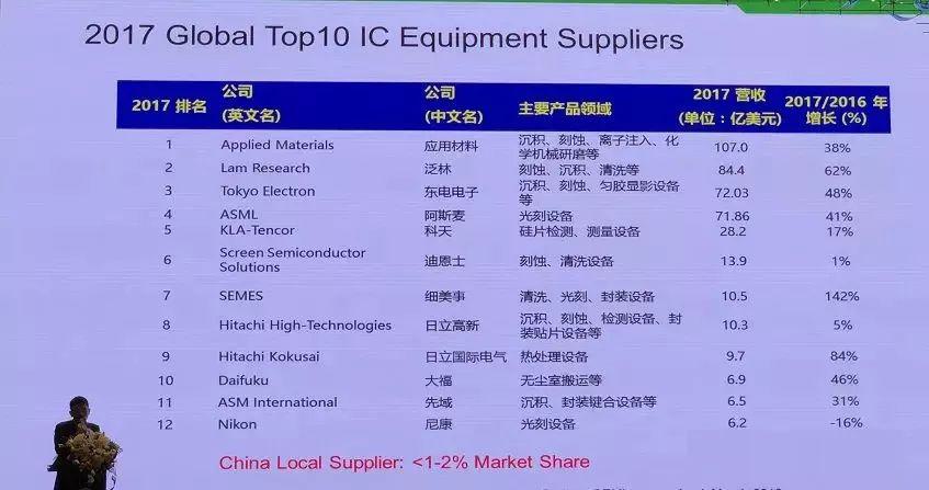 中外半導體設(shè)備實力的差距本就不可同日而語,幾個月前的《2018中國集成電路創(chuàng)新應用高峰論壇》上,SEMI中國區(qū)總裁居龍,發(fā)布了由SEMI統(tǒng)計的2017年全球前10的IC設(shè)備廠商排名。如下圖。