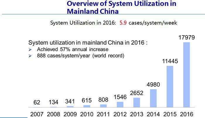 從中國(guó)區(qū)手術(shù)量來看(上圖),2010年全年的手術(shù)量是615臺(tái),到了2016年手術(shù)量達(dá)到1.8萬臺(tái),預(yù)計(jì)2017年會(huì)突破2.7臺(tái),上半年已經(jīng)有1.2萬臺(tái)的手術(shù)量?,F(xiàn)在每周的手術(shù)量是600多臺(tái),已經(jīng)達(dá)到2010年全年的水平。