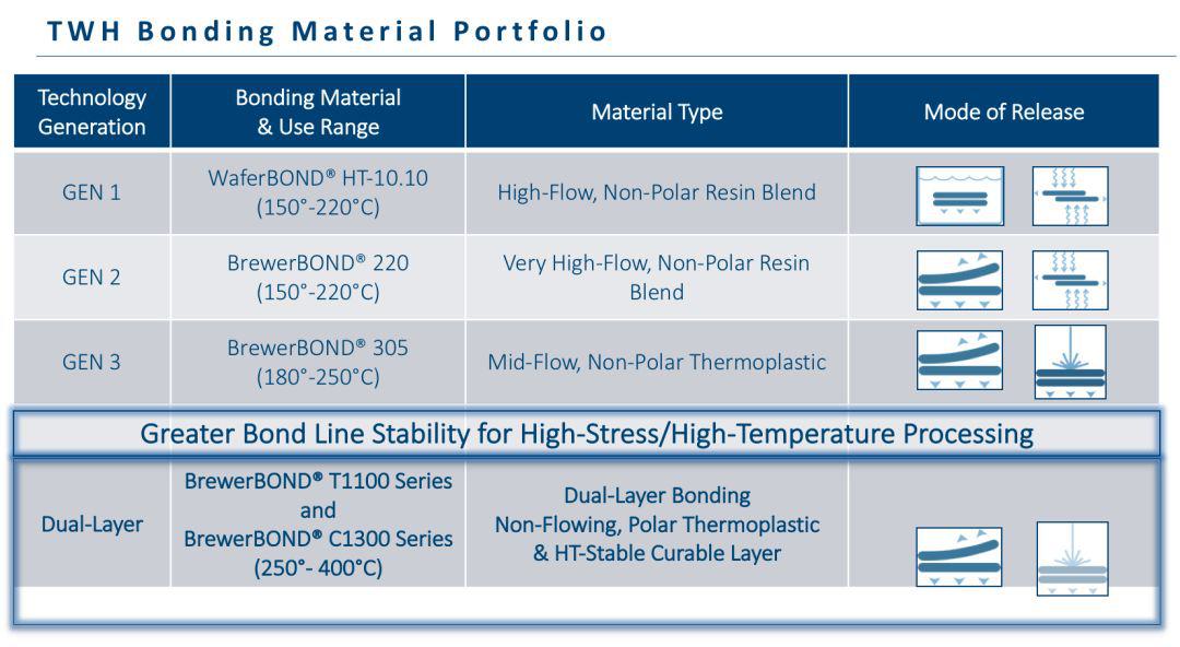 這些需求對(duì)材料商而言也帶來了新挑戰(zhàn),如臨時(shí)接合材料需耐高溫、容易分離不殘留、更廣泛的熱循環(huán)等,因此專注于協(xié)助客戶進(jìn)入更新制程與封裝技術(shù)的Brewer Science,推出Dual-Layer一代的BrewerBOND® T1100/C1300系列材料,作為因應(yīng)。