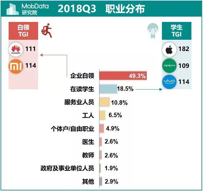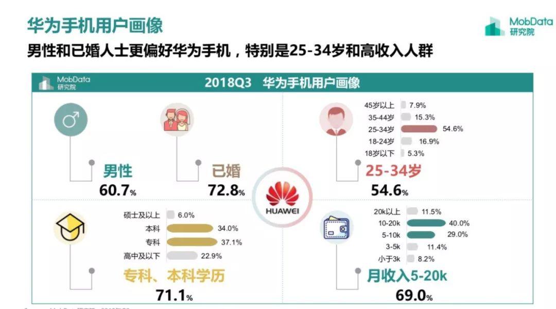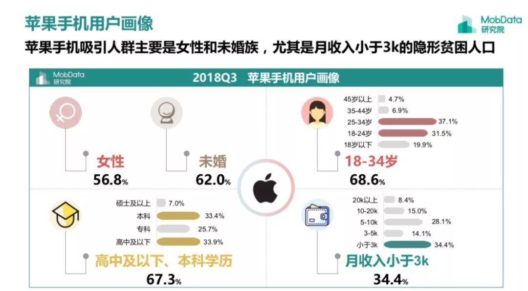 前不久MobData發(fā)布了其2018年第三季度智能手機(jī)調(diào)研數(shù)據(jù),其中對(duì)蘋果及四大國(guó)產(chǎn)手機(jī)廠商華米OV的用戶畫像又引發(fā)關(guān)注,也被很多媒體引用。不少轉(zhuǎn)載的媒體、自媒體更突出宣傳“窮人用蘋果,富人用華為”,用MobData自己的話來說就是:蘋果手機(jī)吸引人群主要是女性和未婚族,尤其是月收入少于3K的隱形貧困人口;華為和已婚人士更偏好華為手機(jī),特別是25-34歲和高收入人群。