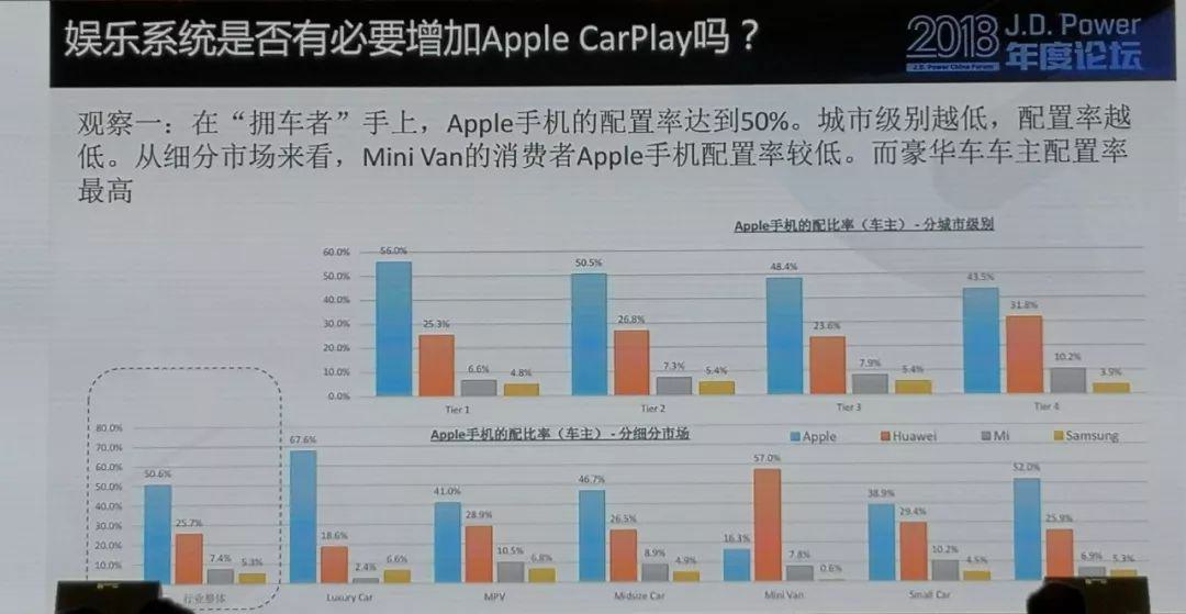 而MobData給出華為手機(jī)用戶多有車有房而蘋果用戶多無房無車的結(jié)論更讓人生疑。至少在汽車這一項(xiàng),我們可以找到其他數(shù)據(jù)可以佐證。根據(jù)汽車市場(chǎng)調(diào)研公司君迪(J.D.Power)給出的數(shù)據(jù),中國(guó)車主配備蘋果手機(jī)的比例超過50%,而華為約為蘋果的一半,比例為25%。