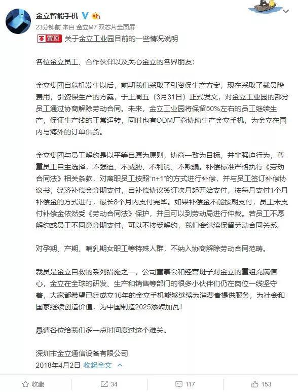 再比如,今年4月2日,金立手機(jī)官微發(fā)表聲明:“裁員是金立自救的系列措施之一,公司董事會(huì)和經(jīng)營(yíng)班子對(duì)金立的重組充滿信心,懇請(qǐng)各位給我們多一點(diǎn)時(shí)間度過(guò)這個(gè)難關(guān)?!边@條聲明所對(duì)應(yīng)的就是此前陷入危機(jī),而采取裁員自保。