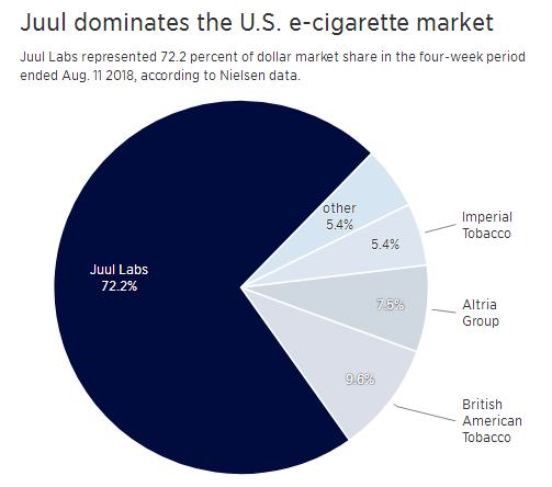 先看一組來自尼爾森的數(shù)據(jù),在截至今年8月11日的過去12個月中,Juul舊金山公司售出了12.9億美元的vape套件和尼古丁Pods,占整個類別23.1億美元總值的一半以上。