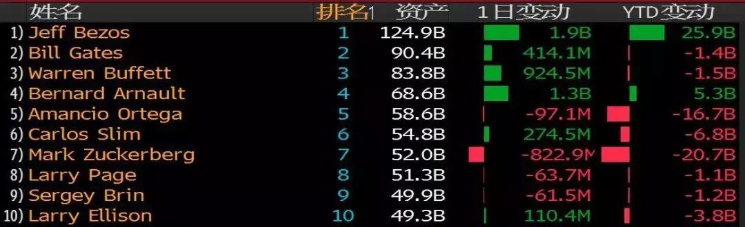 彭博社發(fā)布了最新的彭博億萬富翁指數(shù)榜單:截至2018年12月31日,貝佐斯、比爾·蓋茨、巴菲特是全球排名前三的富翁,身家分別為1249億美元、904億美元、838億美元。受全球金融市場(chǎng)表現(xiàn)不佳沖擊,除了貝佐斯,其他兩位的財(cái)富都在2018年縮水。