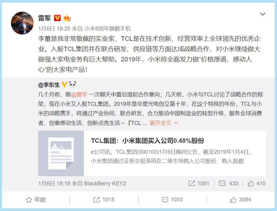 隨后小米CEO雷軍與TCL CEO李東生在微博進行了一次互動(如下),從言辭來看,頗具商業(yè)互吹的味道。
