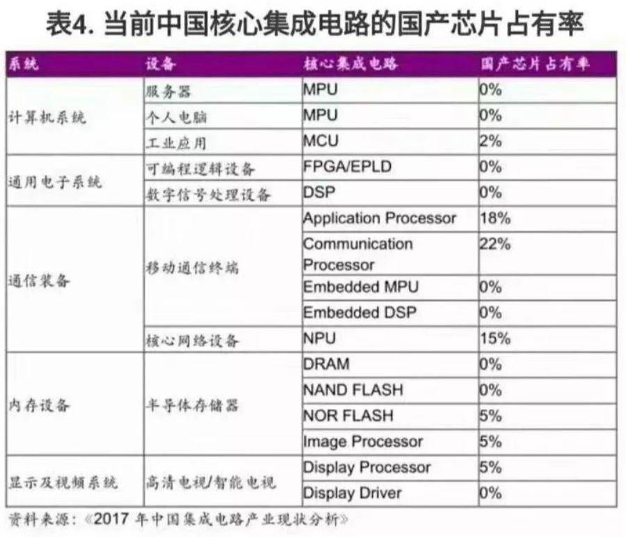 其實“恨鐵不成鋼”的言論并沒有錯,在去年4月份的時候,有一個財經(jīng)博主放出一張圖(如下),凸顯了中國核心集成電路國產(chǎn)芯片的窘境。