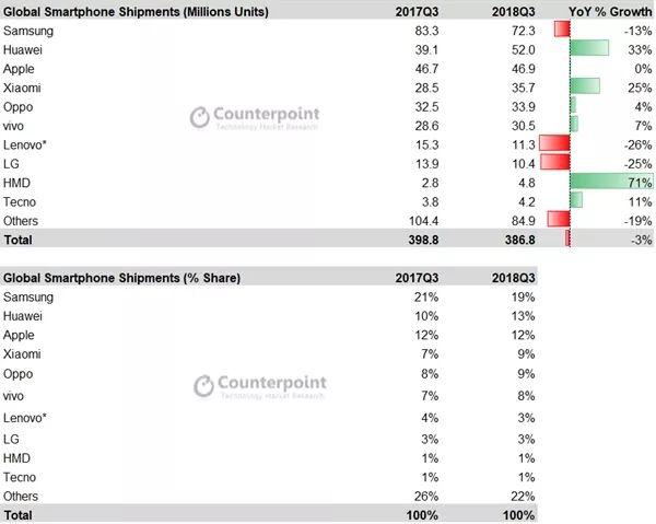 第一個是大眾熟知的智能手機產(chǎn)業(yè),2018年11月份 Counterpoint給出了第三季度全球智能手機相關數(shù)據(jù)(如下圖),整體來看出貨量同比下滑3%,跌至3.868億臺。大廠三星和蘋果一個同比下跌13%,一個0%。而華為、小米、OV等國內(nèi)手機品牌都出現(xiàn)了逆勢增長情況,華為、小米更是增長率驚人(前者33%,后者25%。)