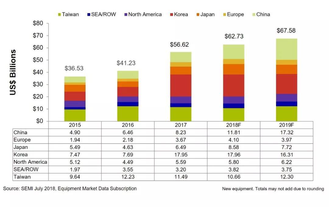 此外,2018年7月份,SEMI(國際半導體產(chǎn)業(yè)協(xié)會)在年度SEMICON West展覽會上發(fā)布年中預測(如下圖),表示2018年半導體制造設備全球的銷售額預計增加10.8%至627億美元。中國大陸的增速夸張,2017年銷售額還是82.3億美元,2018年就能達到118.1億美元,2019年更是將要達到173.2億美元。瘋狂的增速。