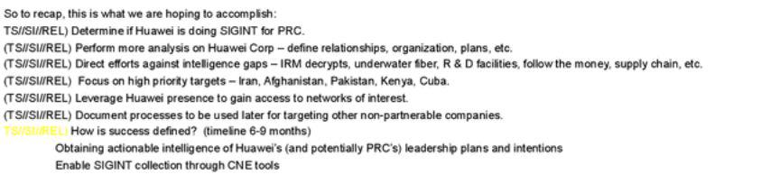 “該計劃設(shè)計竊取華為產(chǎn)品的源代碼,以發(fā)現(xiàn)漏洞。這些安全漏洞可能被NSA利用并監(jiān)控使用華為設(shè)備的國家,如伊朗、阿富汗、巴基斯坦、肯尼亞和古巴。據(jù)《紐約時報》報道,斯諾登2010年獲得一份NSA內(nèi)部文件指出:“我們許多目標(biāo)是通過華為產(chǎn)品進行通信”,“我們想確保知道如何開發(fā)這些產(chǎn)品……”“進入世界各地的網(wǎng)絡(luò)中去?!?