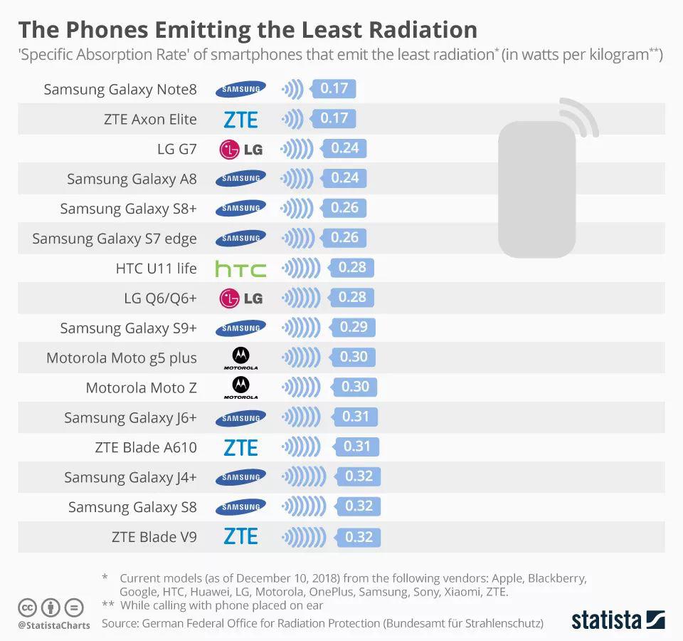 statista還提供了一個在售手機(jī)輻射最低榜單,三星表現(xiàn)不俗,2018年有8款位列最低輻射榜前十六榜單,中興、LG和摩托羅拉均各有兩款入榜。三星在2017年榜單中也有6款位列最低輻射榜前十六,中興和摩托羅拉各有兩款入榜,而LG也有一款入榜。這些歷史悠久的手機(jī)或通訊設(shè)備廠商,對于電磁輻射的控制能力更高一籌。2017年入榜的手機(jī)還有索尼、谷歌和諾基亞,其中谷歌應(yīng)有部分技術(shù)來自于摩托羅拉。