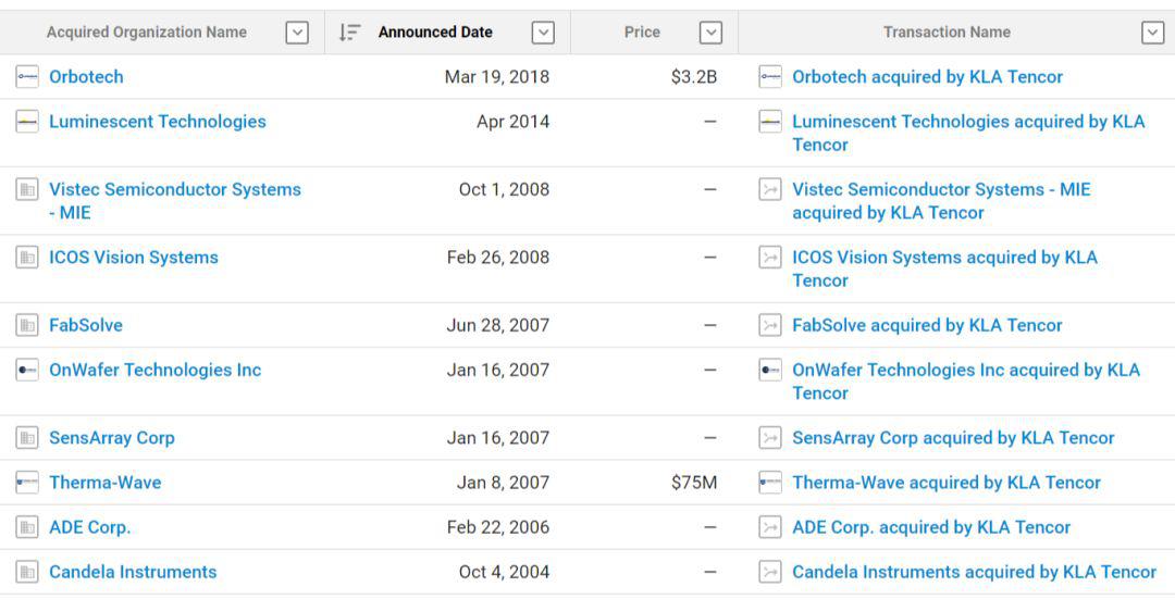 從科天的發(fā)展史來看,收購對其來說不算是一件新鮮事,下圖為Cruchbase整理的部分科天收購事件。就連自己本身都是在1997年由KLA和Tencor兩家公司合并形成的。通過一次次收購?fù)瓿墒袌鐾卣埂?