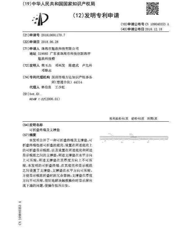 2018年12月,有網(wǎng)友曝料稱魅族也已經(jīng)著手可折疊屏項目,并且已經(jīng)拿到了相關(guān)專利,未來極有可能也會推出可折疊屏手機。