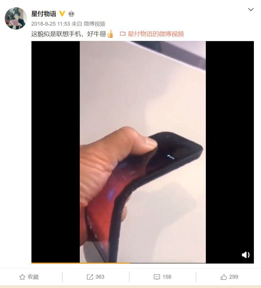 2018年9月,有網(wǎng)友在微博上分享了一段可折疊手機的上手視頻,該手機下方有“Lenovo”的標志。