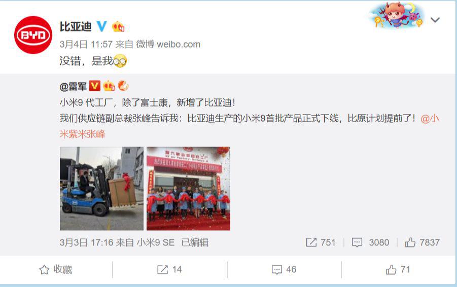 最近,小米CEO雷軍一條微博硬生生把比亞迪三個字拉到了米粉面前。“小米9代工廠,除了富士康,新增了比亞迪!”評論區(qū)的米粉們炸開了鍋,開始懷疑造車的比亞迪為什么代工小米9?