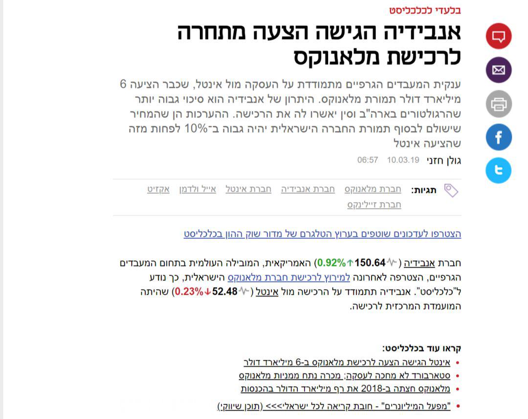 Calcalist網(wǎng)站報(bào)告英偉達(dá)收購Mellanox新聞截圖
