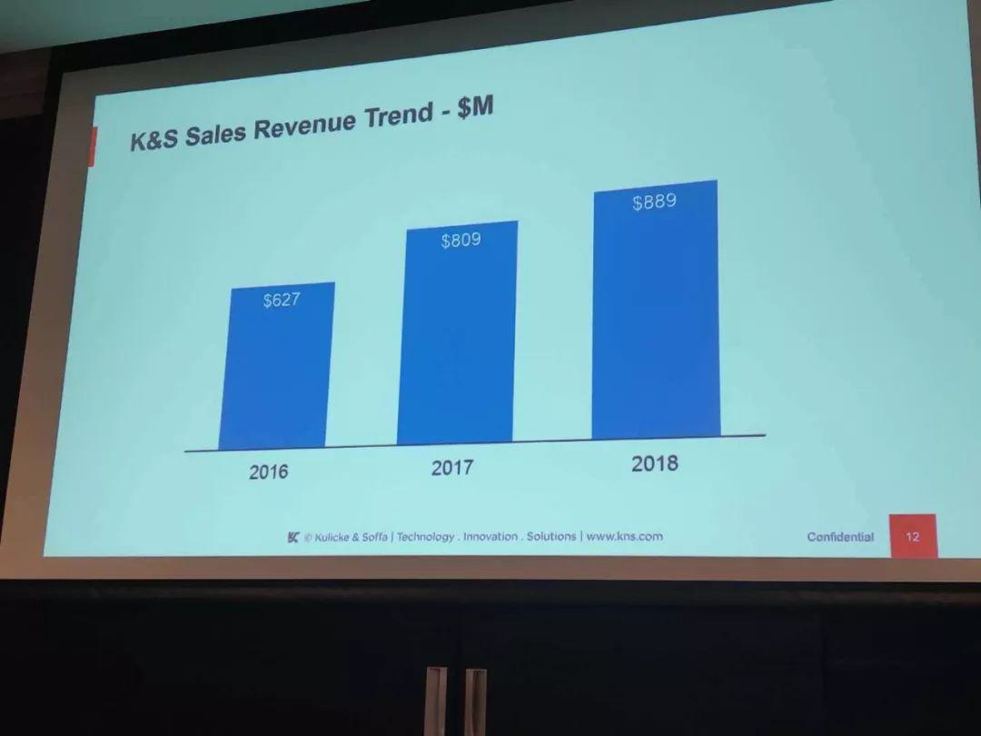 不過(guò)Kulicke & Soffa(庫(kù)力索法,下簡(jiǎn)稱“K&S”)似乎有一套更為穩(wěn)妥的方法——“跟著大客戶的需求前進(jìn),這些大客戶往往是國(guó)際頂尖公司?!贝嗽挸鲎訩ulicke & Soffa集團(tuán)高級(jí)副總裁張贊彬之口,這種穩(wěn)健似乎也成就了K&S過(guò)去幾年不斷增長(zhǎng)的成績(jī)單(如下圖),從2016年的6.27億美元到2017年的8.09億美元,再到2018年的8.89億美元。而對(duì)于今年?duì)I收的預(yù)測(cè),張贊彬略表悲觀,原因則是眾所周知的全球經(jīng)濟(jì)行情悲觀,與半導(dǎo)體整體處于下行周期。