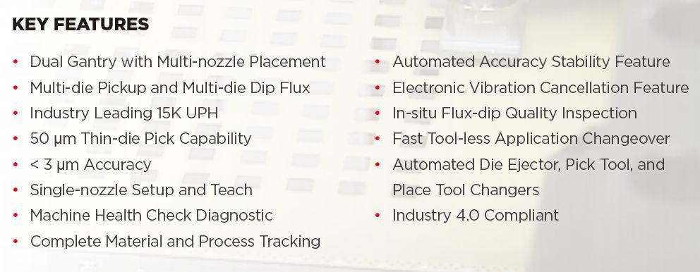 Flip-Chip也是今天K&S所介紹的產(chǎn)品中的一大主角,據(jù)K&S資料顯示:“名為Katalyst的設(shè)備為倒裝芯片放置提供了業(yè)界最高的精度和速度。其硬件和技術(shù)可在基板或晶圓上實(shí)現(xiàn)3μm的精度,從而實(shí)現(xiàn)業(yè)內(nèi)最高性價(jià)比?!本唧w參數(shù)如下: