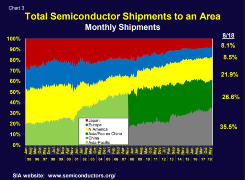 上圖顯示了半導(dǎo)體設(shè)備出貨量的地理變化。盡管半導(dǎo)體設(shè)備出貨量相較于半導(dǎo)體的出貨量而言,月波動(dòng)性更大,但其向亞洲轉(zhuǎn)移的趨勢是顯而易見的。