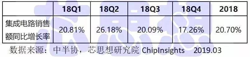 受到2018年第四季度全球半導(dǎo)體市場下滑影響,中國集成電路產(chǎn)業(yè)2018年第四季同比增幅只有17.26%,相較前三季度略有下降;相較2018年第二季的增幅26%.18,第四季下滑了9個(gè)百分點(diǎn)。