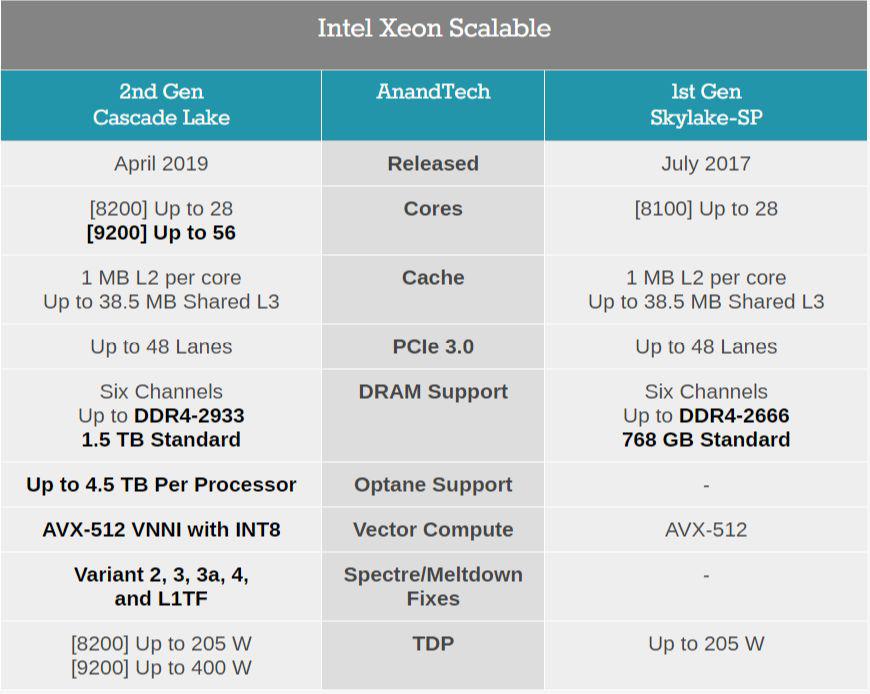 據(jù)資料顯示,英特爾發(fā)布的二代至強可擴展處理器屬于Cascade Lake家族,取代2017年推出的Skylake-SP系列處理器。二代Xeon Scalable處理器可以分為Xeon Platium(鉑金) 9200/8200、Xeon Gold 6200/5200、Xeon Silver 4200、Xeon Brone 3200系列,其中Xeon Platium 9200有四款,核心數(shù)分別是32、32、48及56。英特爾稱:今天上市的第二代英特爾至強可擴展處理器以強大的平臺能力,實現(xiàn)了在性能、人工智能推理、網(wǎng)絡功能、持續(xù)內存帶寬和安全等方面的革新性飛躍。