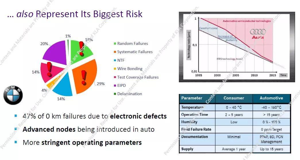 3,半導(dǎo)體推動汽車革命,但也帶來風(fēng)險(xiǎn),從下圖中可以看出,有大約47%的零公里故障來源自電子元件的缺陷(其中囊括隨機(jī)故障(18%),系統(tǒng)故障(29%)和測試覆蓋率故障(14%))。