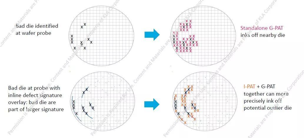 Becky Howland指出此時介紹KLA的最新技術(shù)I-PAT (在線零件平均測試 Inline PAT,縮寫:I-PAT)再合適不過。相較于傳統(tǒng)方法G-PAT (Geographic Part Average Testing)來說,I-PAT可以犧牲較少的良率,讓本應(yīng)該是好的但卻被丟棄的好的芯片保留,這樣不僅提高可靠性,還能省錢。