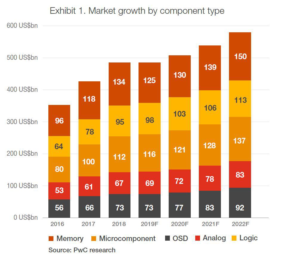 鑒于如今科技創(chuàng)新迅猛,有望促進(jìn)半導(dǎo)體行業(yè)持續(xù)增長。經(jīng)過2019年的相對疲軟之后,我們預(yù)測半導(dǎo)體行業(yè)將在2020年實現(xiàn)復(fù)蘇。2018年半導(dǎo)體銷售總額為4810億美元。此后的四年,到2022年,半導(dǎo)體銷售額將保持較慢速但健康的增長,年復(fù)合增長率約為4.6%,到2022年底半導(dǎo)體年銷售額將達(dá)到5750億美元。