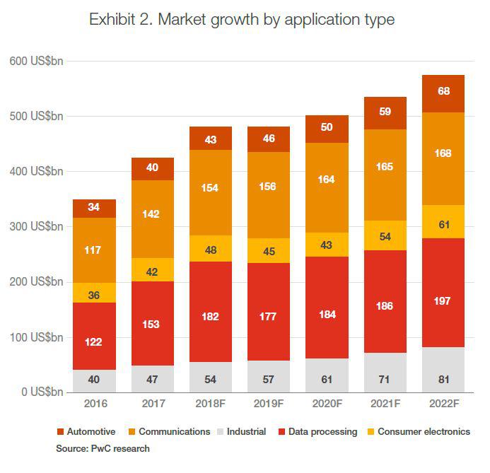 由于電動汽車和混合動力汽車的普及率不斷提高,再加上自動駕駛汽車市場的巨大潛力,汽車市場將增幅最大。到2022年,其年復(fù)合增長率將達(dá)到11.9%。與此同時,市場對傳統(tǒng)汽車芯片的需求依舊強勁。由于受到人工智能芯片需求擴大以及安全和醫(yī)療領(lǐng)域的推動,工業(yè)市場的年復(fù)合增長率也將達(dá)到10.8%。
