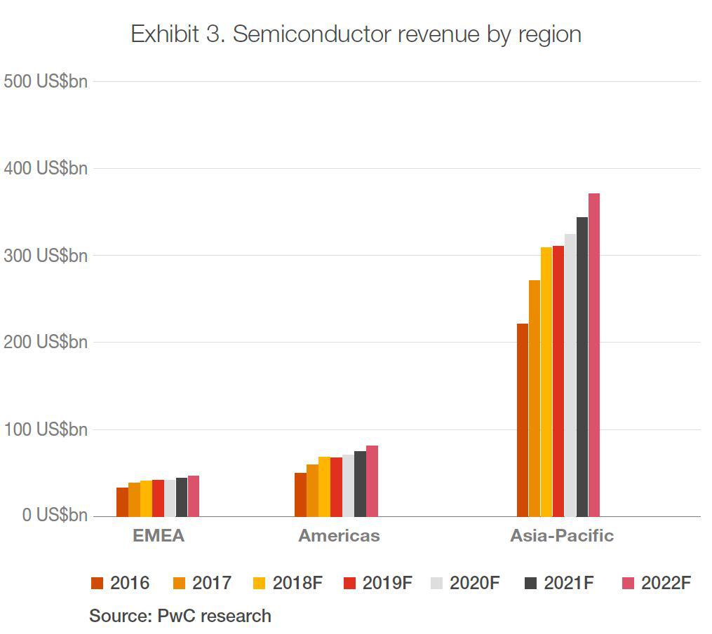 亞太地區(qū)的繼續(xù)成為半導(dǎo)體收入的主要來源,到2022年,該地區(qū)的年復(fù)合增長率為4.8%。此地區(qū)依舊以中國為主導(dǎo),中國是全球最大的芯片買家和進(jìn)口國。