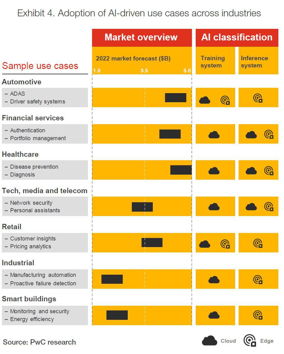在工業(yè)領(lǐng)域,所產(chǎn)生的收入大致為15億美元到20億美元之間,主要用于制造業(yè)優(yōu)化和主動故障檢測。因為工業(yè)客戶的部署和更新周期較長,所以實現(xiàn)人工智能需要比其他行業(yè)更長的時間。