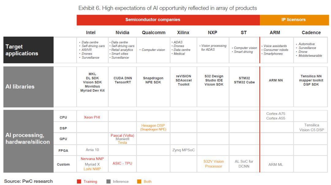 此外,IP廠商如ARM、Cadence提供軟CPU和DSP IP內(nèi)核,他們假設(shè)未來人工智能處理器將嵌入ASIC,而不是由專門用于人工智能工作的獨立芯片完成。這些公司的模型是允許客戶授權(quán)人工智能軟核來開發(fā)針對人工智能應(yīng)用的芯片。與此同時,財力雄厚的英特爾正在廣泛押注不同構(gòu)架——CPU、FPGA和定制ASIC——來滿足各類要求。此外,英偉達(dá)也提供了非常多樣化的芯片方案。