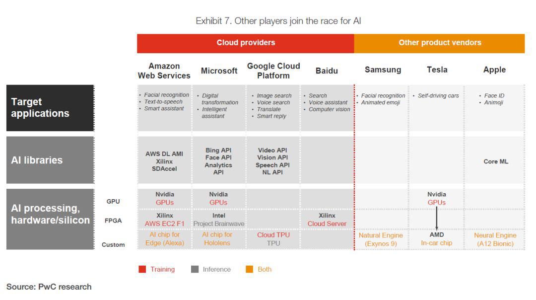 一些公有云提供商會自己開發(fā)定制芯片來優(yōu)化自身產(chǎn)品,這必然會威脅到傳統(tǒng)芯片制造商如英特爾、Nvidia和Xilinx的市場地位。雖然存在不少定制芯片,但我們預(yù)計GPU和FPGA將共存于云中,以加速人工智能工作負(fù)載。
