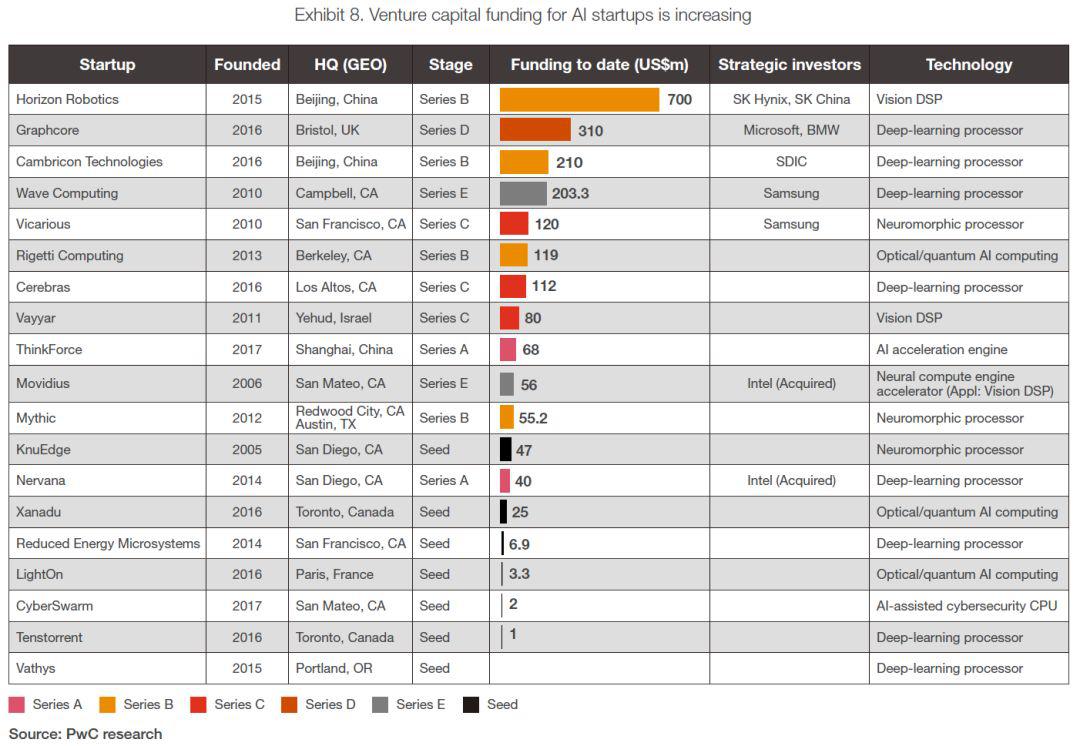 人工智能這波誘人前景,正在引發(fā)大量創(chuàng)新。近年來,對人工智能初創(chuàng)企業(yè)的風(fēng)險投資也在大幅增加。2017年達(dá)到110億美元的新高,用于投資人工智能和機器學(xué)習(xí)公司。如表8所示,排名前19位的人工智能半導(dǎo)體初創(chuàng)公司,有11家來自美國,其中大多數(shù)在探索為各種人工智能和深度學(xué)習(xí)工作負(fù)載而定制專用處理器架構(gòu)。其中有9家正在建造深度學(xué)習(xí)處理器,3家在開發(fā)所謂的神經(jīng)形態(tài)處理器,這些處理器試圖模擬人類大腦功能方式。