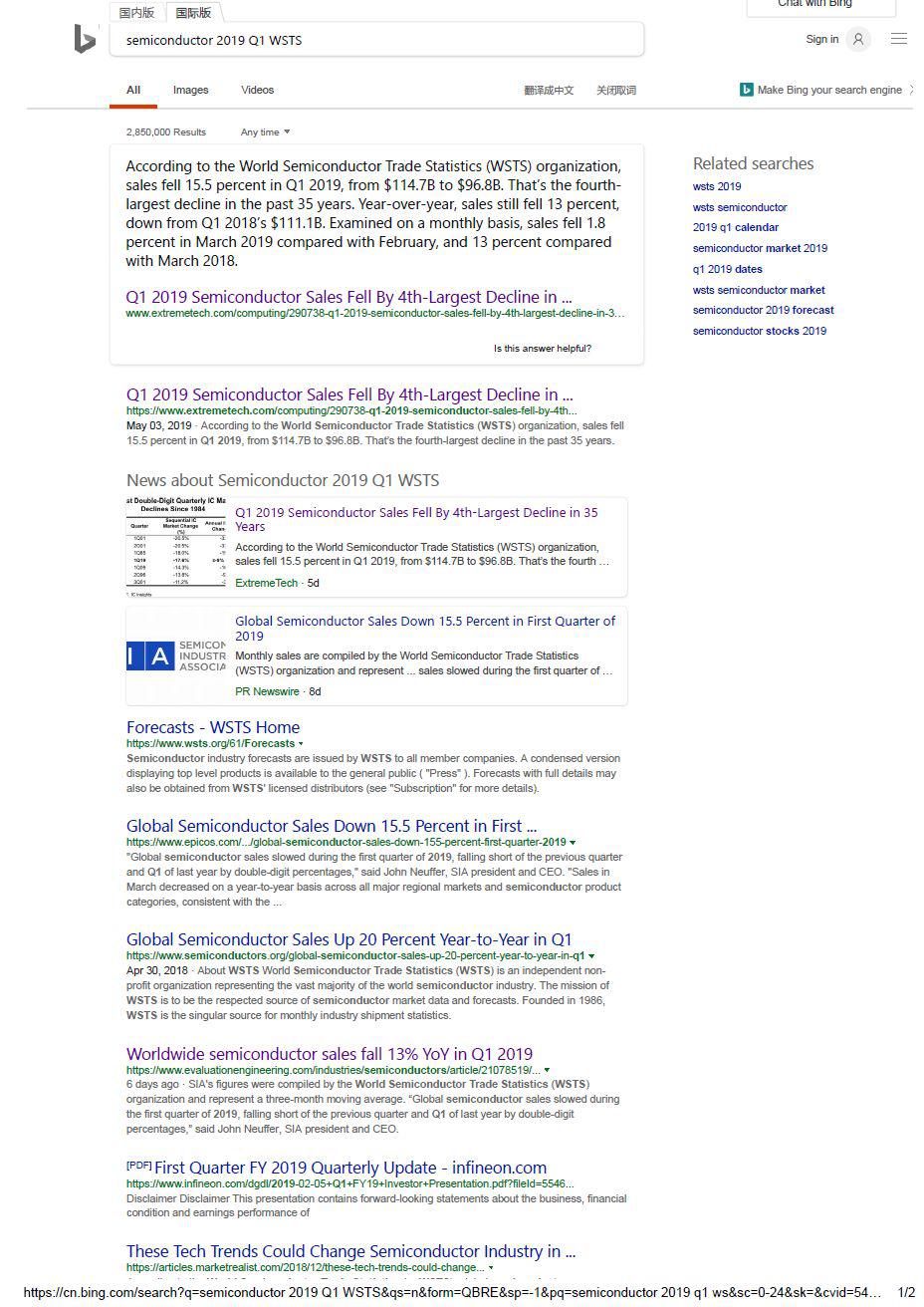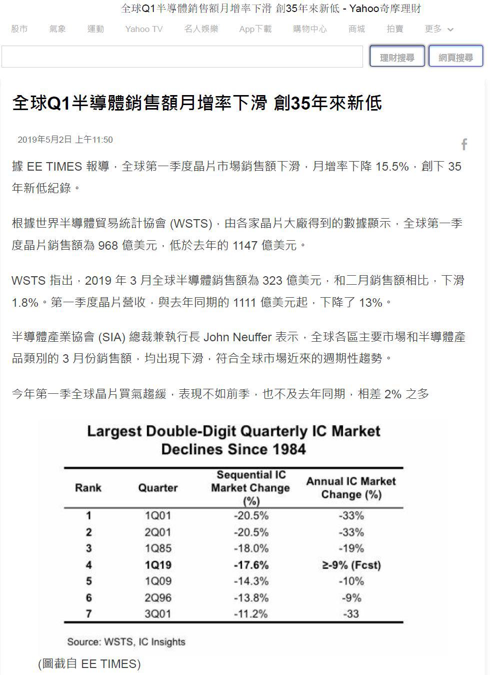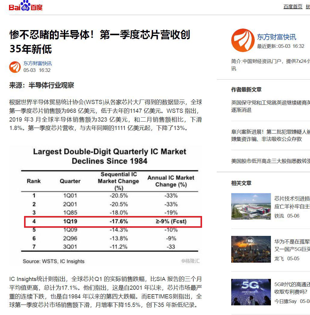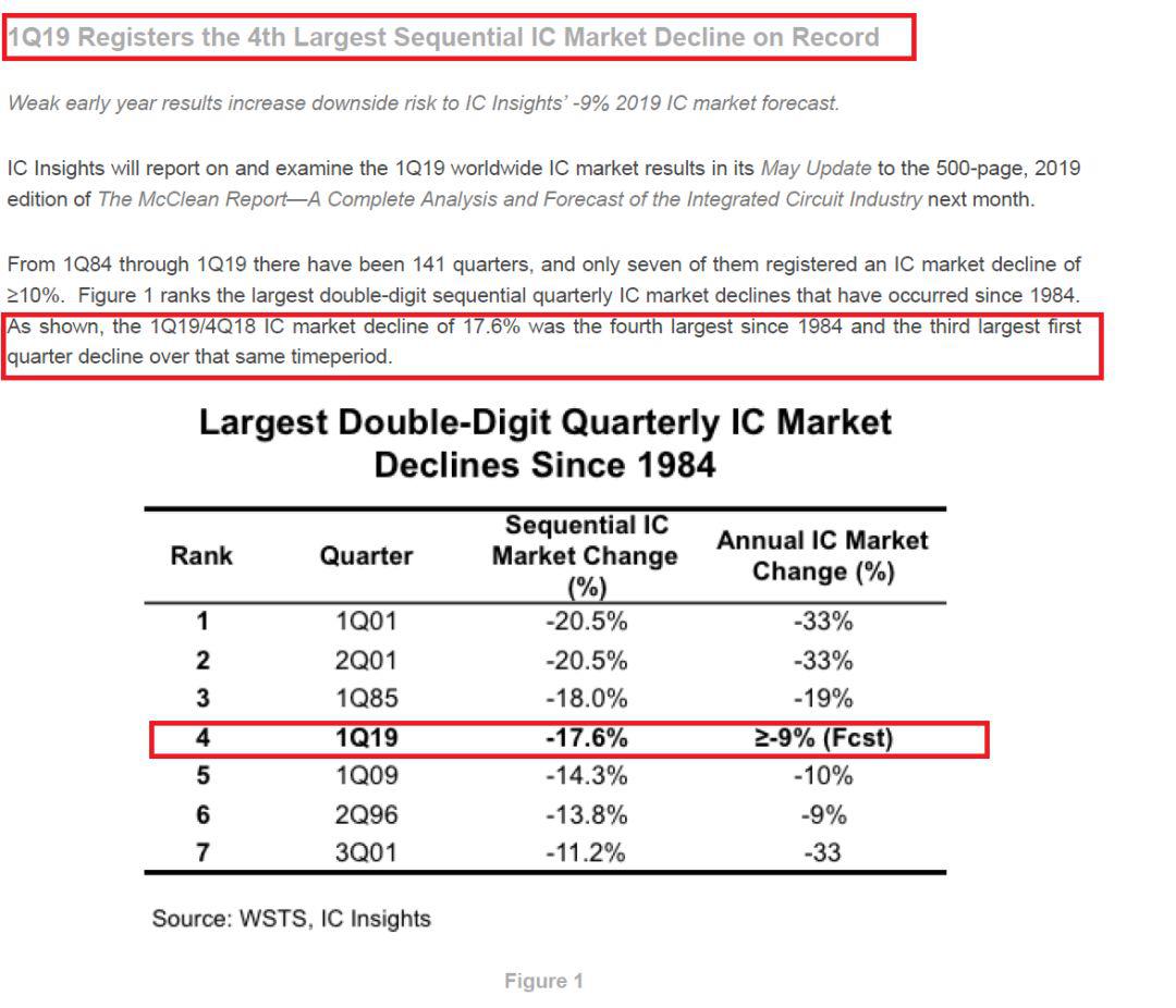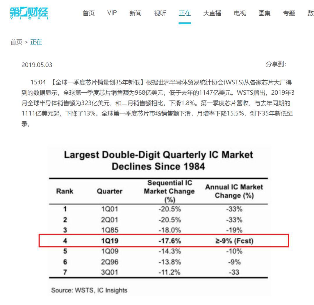 收集了一些素材之后去翻涉及到該報(bào)道的英文原文,事實(shí)又讓我震驚了。無論是世界半導(dǎo)體貿(mào)易組織(WSTS),還是芯片洞察(IC Insights),都沒有給出2019年第一季度季度增幅創(chuàng)35年新低的消息,無論環(huán)比還是同比。